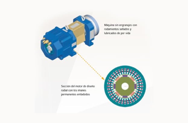 - Máquina sin engranajes con tecnología de imanes permanentes de configuración radial, mucho más compacta y eficiente que una máquina convencional.
